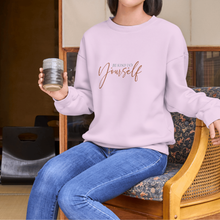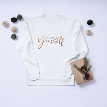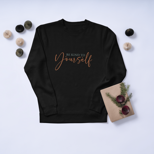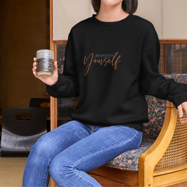 A soft, lived-in crewneck that quietly reminds you to slow down and breathe. Lightweight but warm, this sweatshirt features a delicate, script “Be Kind to Yourself” across the chest in a muted rose tone. The clean, minimal silhouette and neutral base make it easy to layer — mornings with coffee, late-night journaling, or slow walks through the neighborhood. Built to move with you, the classic fit and ribbed collar keep the shape while the cotton-poly blend offers cozy warmth without bulk. This is the everyday pullover that feels like a small, steady encouragement when you need it most.